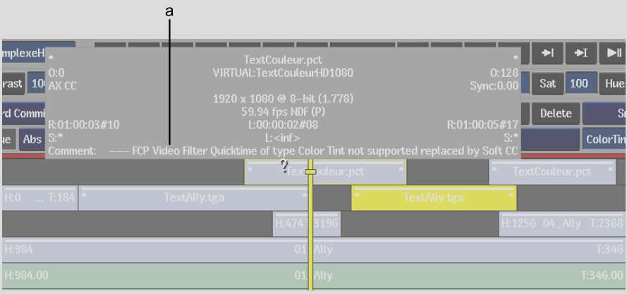 In some cases, a comment indicates how an unsupported effect is translated in Smoke. For example, the FCP colour Tint Video Filter (QuickTime) is not supported in Smoke. It is replaced by a Colour Correction soft effect, from which the colour tint effect can be rebuilt. A comment is added to indicate the name of the original FCP effect.