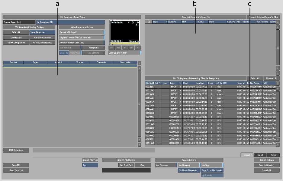 (a) Clip List: List of Clips on Tape (b) Tape List: Recapture From File  (c) List of Segments Referencing Files For Recapture