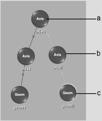 (a) Axis4 is the parent of axis2 and geom2  (b) Geom node represents a wipe mask  (c) Axis for geom 2