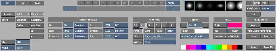 The front clip appears on the Paint canvas, which you can use to apply colours and effects to the clip. The matte clip delimits the area of the front clip affected by painting. The back clip can be revealed or brushed through onto the front clip. The colour of the blank canvas is defined by the wipe colour.