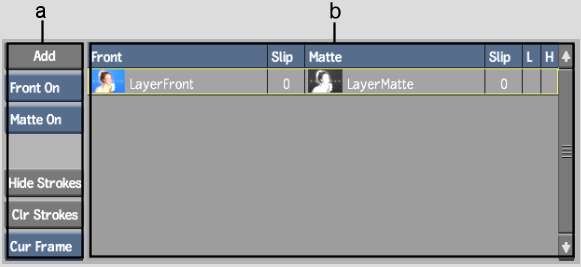 Source Controls and Sources List Displays the front clip, matte clip, and sources. The Sources list manages the sources attached to the current node. A source is composed of a front source and a matte source. See Using Sources.