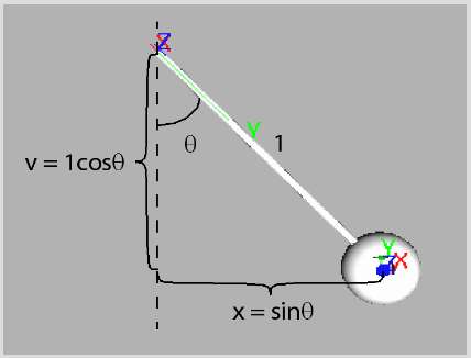 The ball's y position is defined as the negative cosine of the swing angle between the rope and centre axis, multiplied by the length of the rope. This expression is formed similarly to that of the ball_axis.position.x channel. The rope rotates such that its Y-axis is always pointing toward the centre of the ball. The lookat function is used to generate the rotation vector.