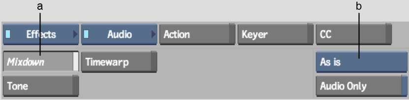 Use the Audio Mixdown tool to mix down your audio with the current AudioDesk output strip assignments, to four channels, to stereo, or to mono. All soft effects such as dissolves, fades, and audio soft effects made to audio anywhere in the application are processed during mixdown. All current AudioDesk and EQ settings are also applied to the mixdown clip.