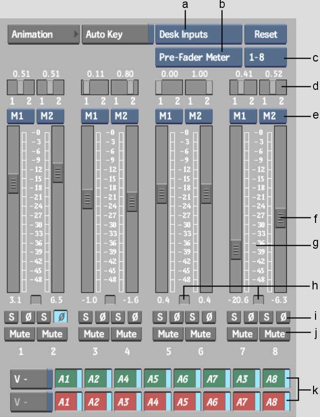 (a) Input/Output Strip option box  (b) Pre-fader/Post-fader Meters option box  (c) Input Strip Display selection box  (d) Pan faders  (e) Output Strip Assignment boxes  (f) Gain Level faders  (g) Input/Output Meters  (h) Gain Fader Lock buttons  (i) Solo and Phase buttons  (j) Mute buttons  (k) Audio Patch buttons